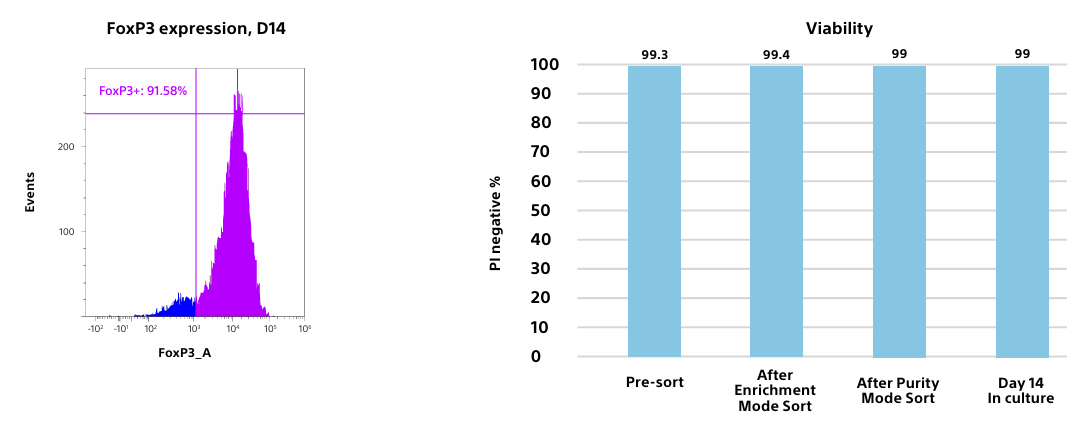 功能性黃金驗證: 真正有價值的細胞,必須是「活著」且「有用」的。Sony 的應用數據顯示,經由 CGX10 分離出的 nTregs,不僅維持極高的存活率 (>99%),更能在體外成功擴增超過 14 天,並持續穩定地高表達 Treg 的關鍵轉錄因子 FoxP3。這證明了 CGX10 的分選過程極其溫和,完整地保留了 Treg 的功能與穩定性。