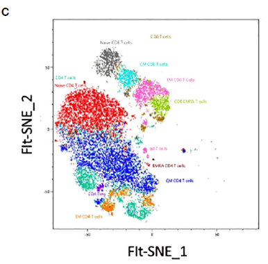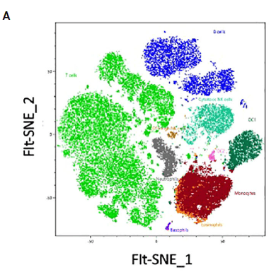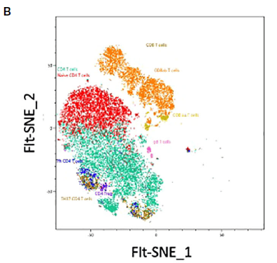 圖2: 利用 Sony ID7000 採集 >40 色 panel 的 PBMC 數據,並透過 FIt-SNE 降維分析,可將不同免疫細胞清晰地分群視覺化。圖中各色塊代表不同的細胞群落(如 T 細胞、B 細胞、單核球等),Treg 細胞也能在此圖中被明確標示出來,完美體現了《指南》所倡導的先進數據呈現方式。