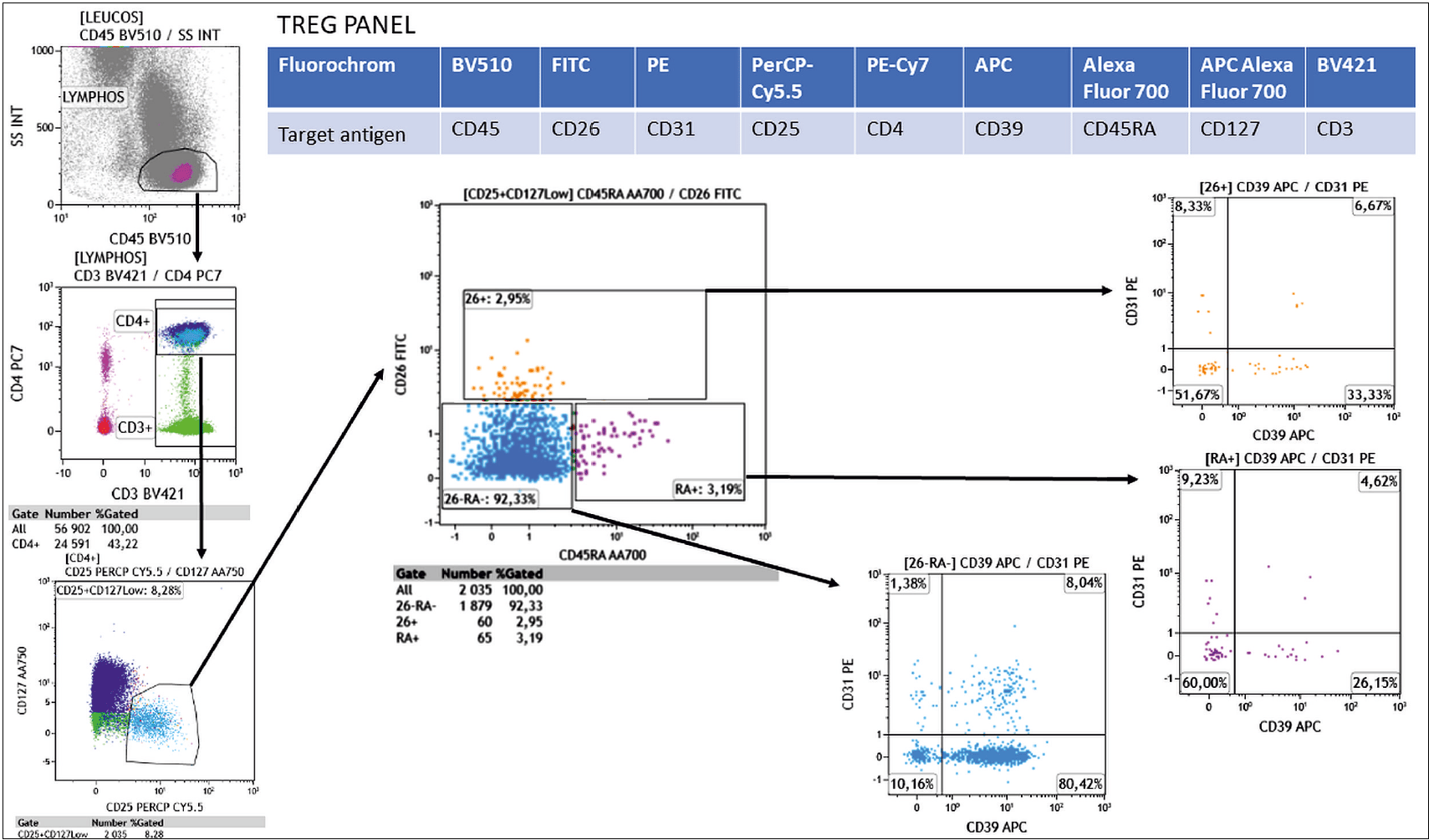 圖1: 遵循《指南》原則,利用多個膜蛋白標記進行循序設門,可精準地從 CD4+ T 細胞中鑑定出整體的 Tregs 族群,並進一步區分出初始型 (Naïve, CD45RA+) 與效應/記憶型 (Effector/Memory, CD45RA-) 等重要亞群。Sony ID7000 的高解析度確保了在每個設門步驟中的準確性。